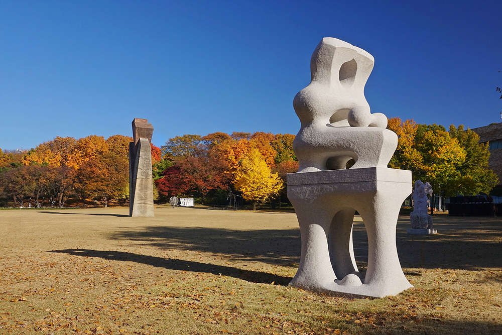 다서 기하학적인 받침대 사이의 공간과 몇 개의 볼륨으로 압축된 인물들 사이의 빈 공간이 조화를 이루며 주변의 풍경과 교류한다 <2025.11.10.올림픽공원>