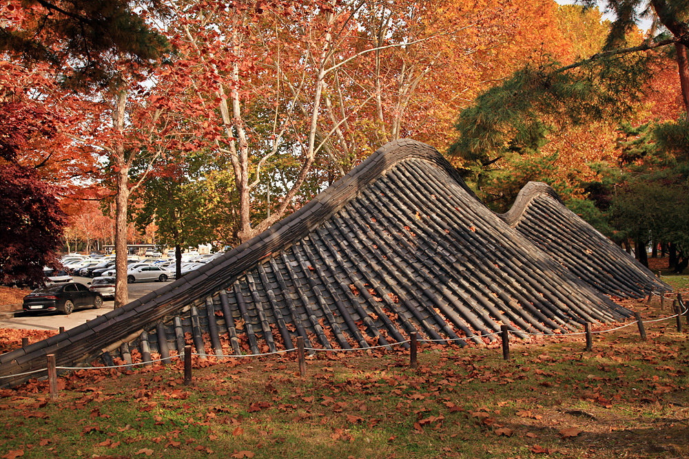 기와의 신비는 우리의 오랜 역사 속에 숨 쉬고 있다.지붕위에 있던 기와가 땅으로 내려와서 광활한 대지와 자연의 품안에서 인간을 감싸고 있다<2025.11.11.올림픽공원>